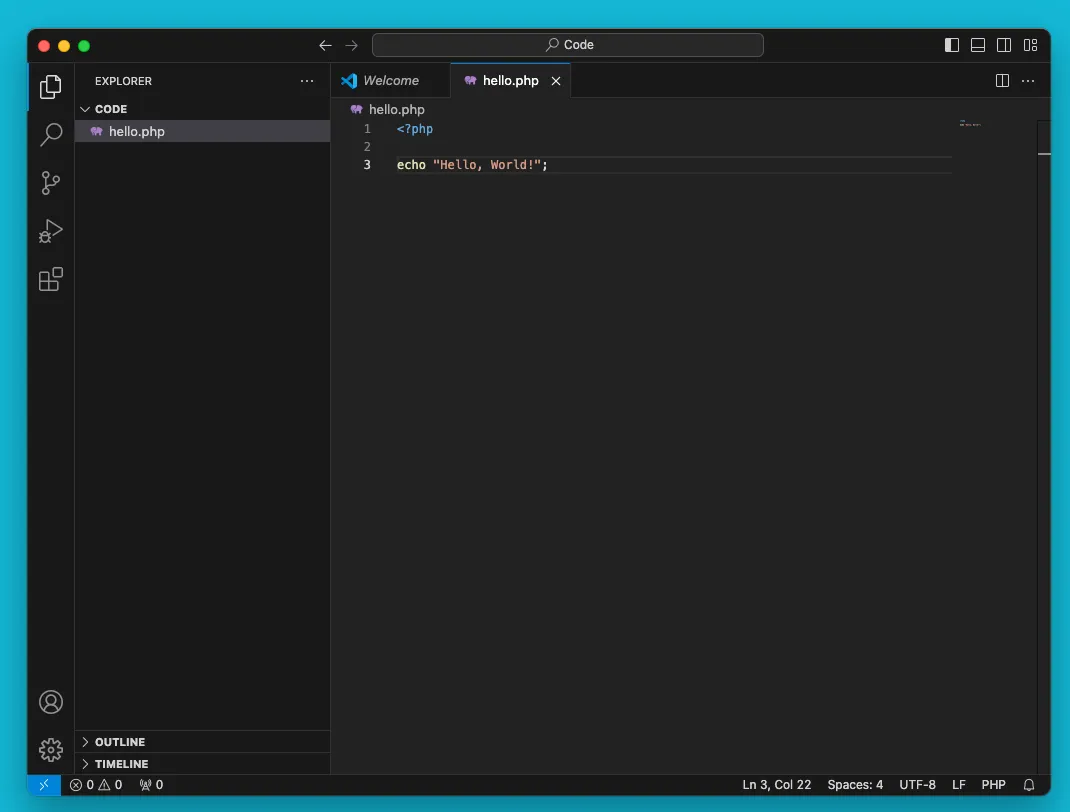 打开 Visual Studio Code。编写你的 PHP 代码,例如: